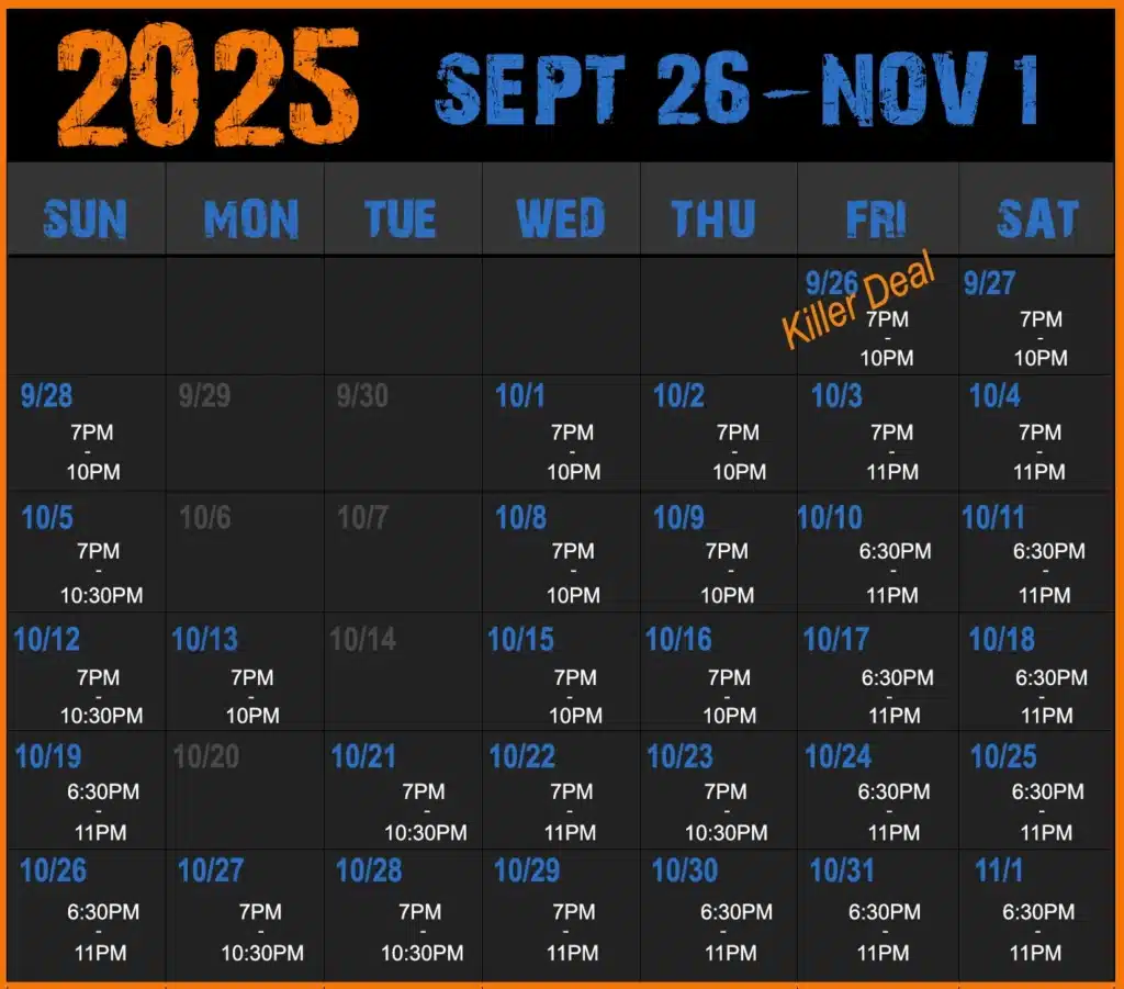 WARNING: All patrons enter at their own risk. Owners & sponsors are not responsible or liable for any harm incurred on the premises. This attraction contains high impact scares and strobe lights which may not be suitable for people with heart conditions or prone to seizures. Attraction may include the use of fog juice as well as spraying water. Sorry, NO pregnant women, infants, or children being carried will be allowed entry. Not recommended for children under 10.